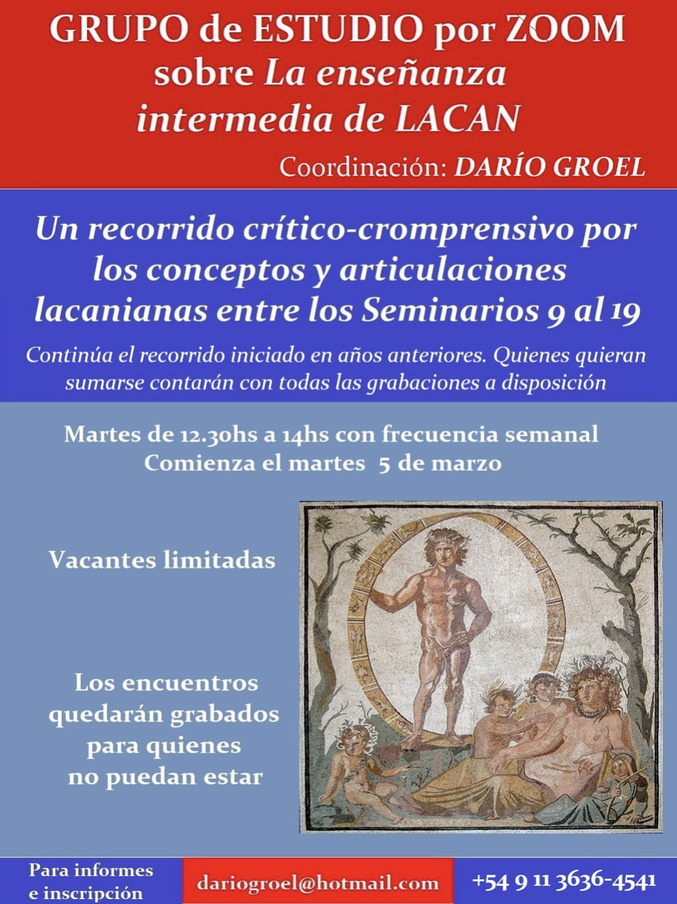 - Grupo de estudio virtual sobre La enseñanza intermedia de Lacan. Para Ex-sistencia, frecuencia semanal los martes de 12.30hs a 14hs.
