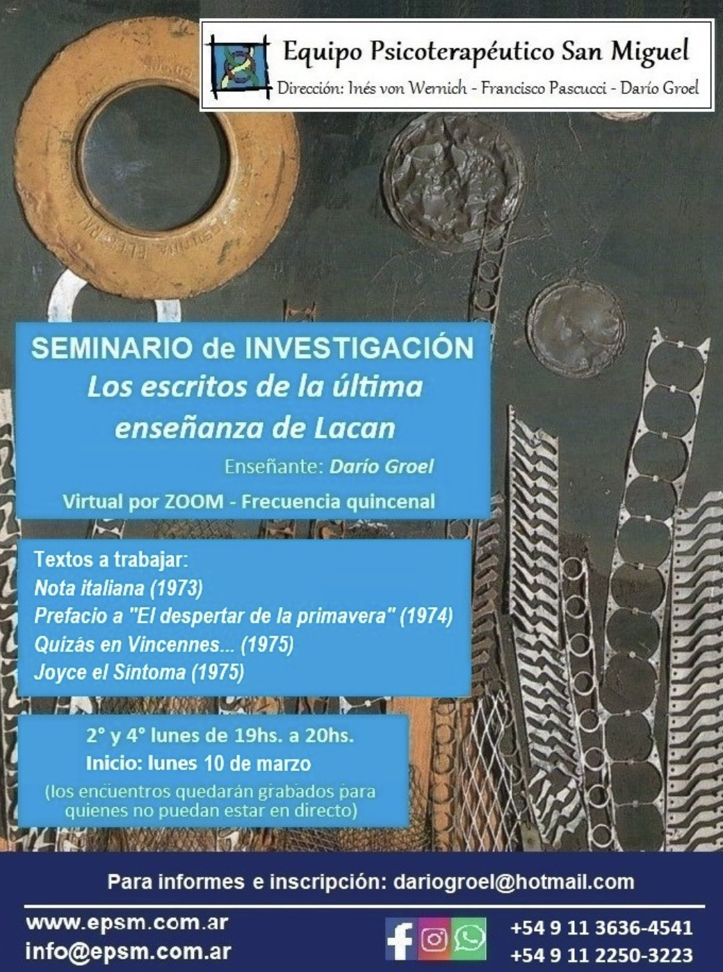 - Curso Virtual La clínica Real-Simbólica-Imaginaria. Fundamentos y problematizaciones a partir del último Lacan. Para Visam, 8 encuentros durante 2025.
