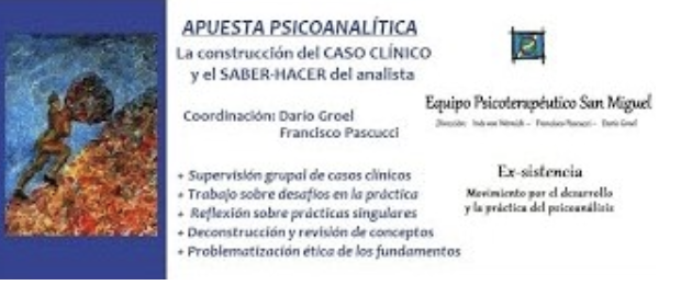 - Grupos de supervisión virtual Apuesta psicoanalítica. Para Ex-sistencia, frecuencia semanal miércoles, jueves o viernes de 12.30hs a 14hs.