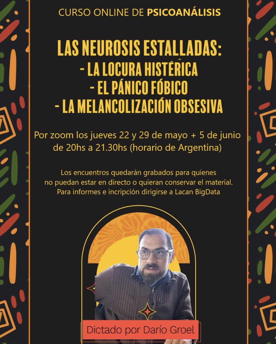- Curso Virtual Las neurosis estalladas: Locuras histéricas, Pánico Fóbico y Melancolización Obsesiva. Para Lacan BigData,3 encuentros en mayo y junio de 2025.