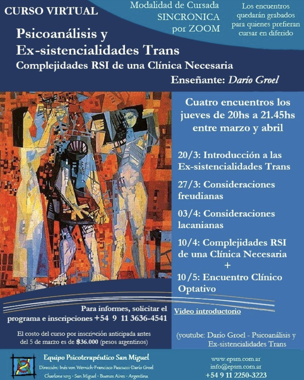 - Curso Virtual Psicoanálisis y ex-sistencialidades trans. Complejidades RSI de una clínica necesaria. Para EPSM y Ex-sistencia, 4 encuentros en marzo y abril de 2025.