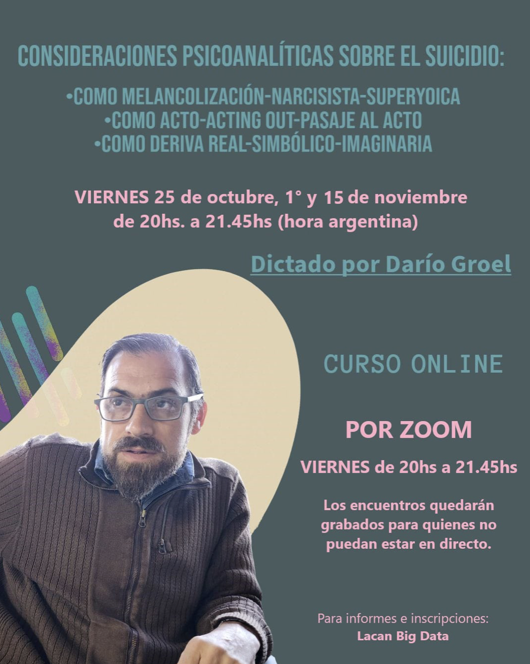 - Curso Virtual Consideraciones psicoanalíticas sobre el Suicidio: como melancolización-narcisística-superyoica, como acto-acting out-pasaje al acto, como deriva real-simbólico-imaginaria. Para Lacan BigData, 3 encuentros en noviembre de 2024.