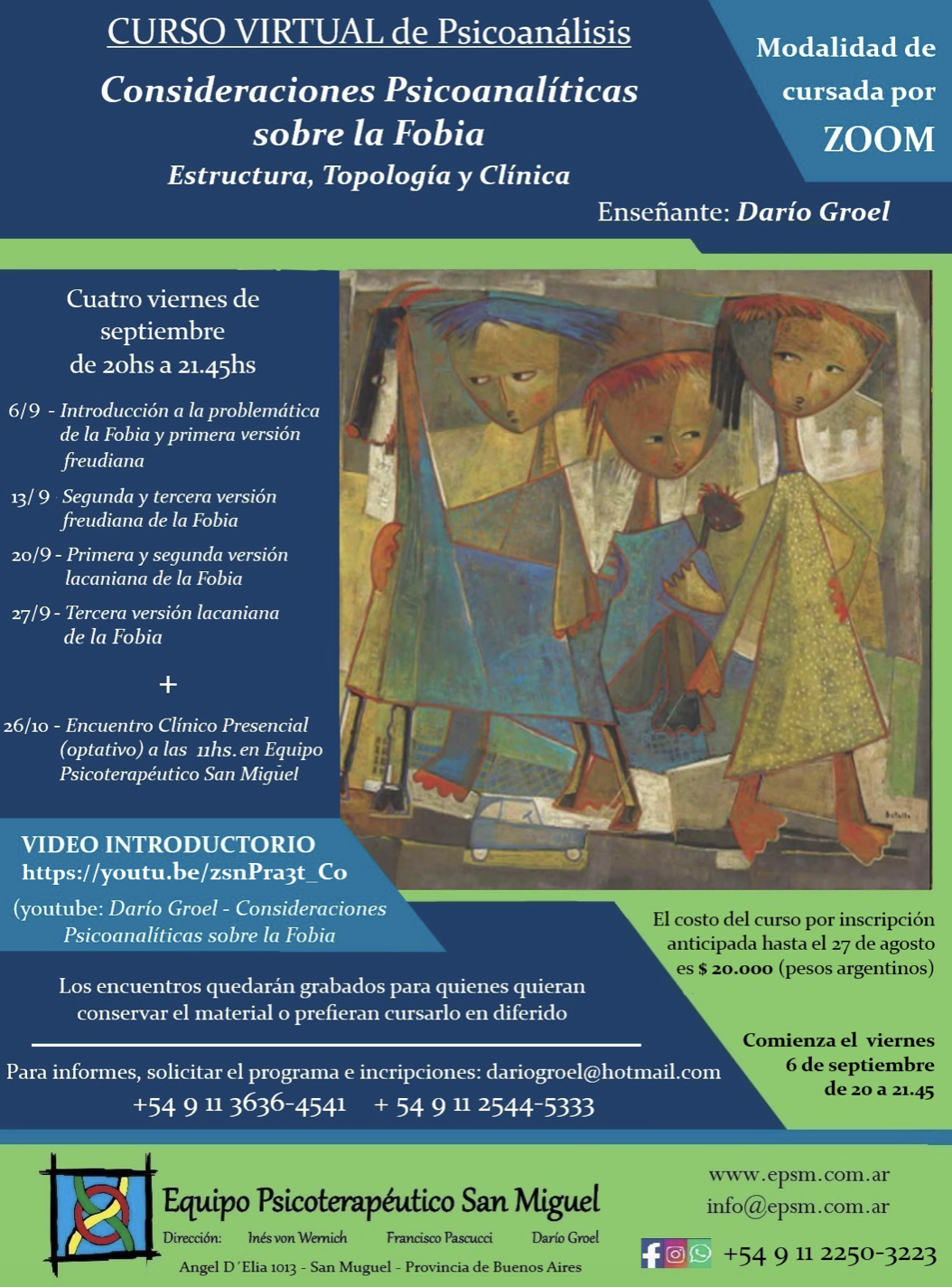 - Curso Virtual Consideraciones psicoanalíticas sobre la fobia: estructura, topología y clínica. Para EPSM y Ex-sistencia, 4 encuentros en septiembre de 2024.