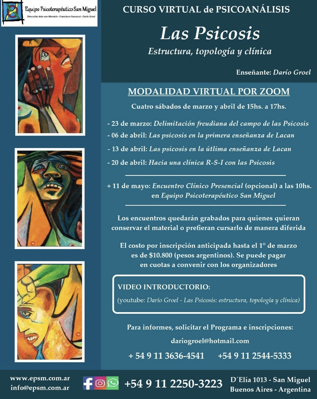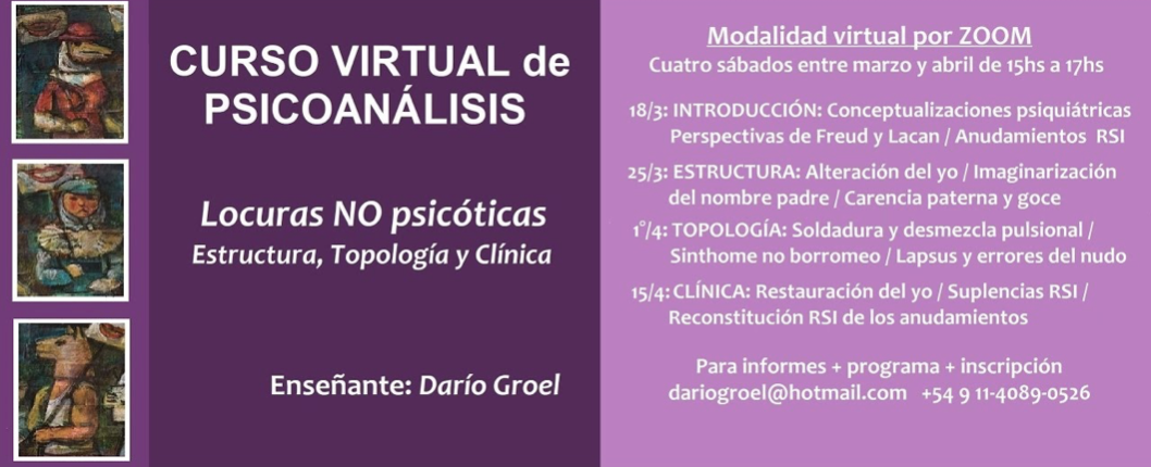 - Curso Virtual Las psicosis: estructura, topología y clínica. Para EPSM y Ex-sistencia, 4 encuentros en marzo y abril de 2024.