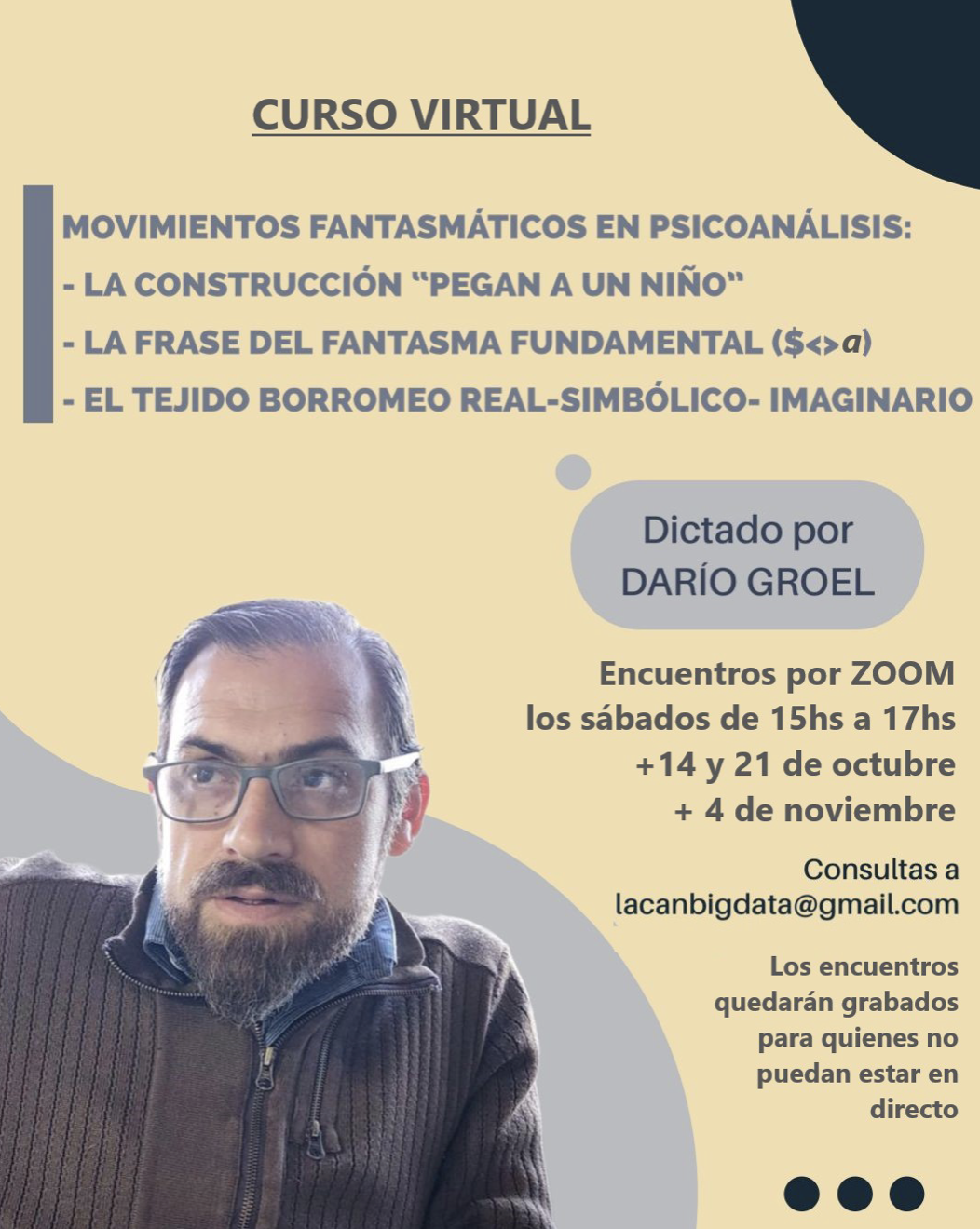 - Curso Virtual Movimientos fantasmáticos en psicoanálisis: la construcción pegan a un niño, la frase del fantasma fundamental $<>a, el tejido borromeo RSI. Para Lacan BigData, 3 encuentros en octubre y noviembre de 2023.