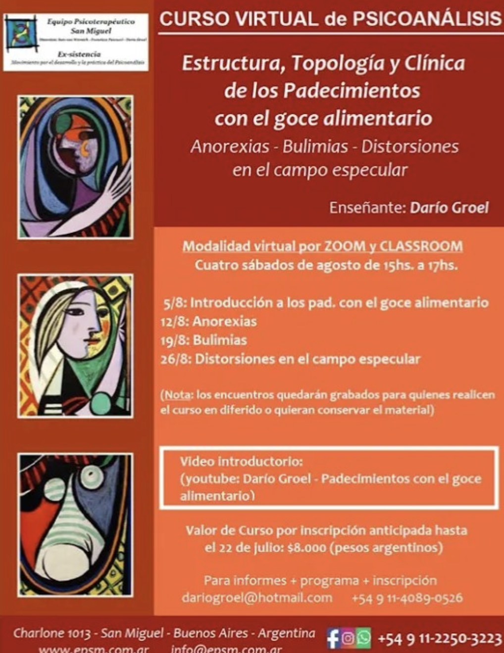 - Curso Virtual Padecimientos con el goce alimentario: anorexias, bulimias y distorsiones especulares. Para EPSM y Ex-sistencia, 4 encuentros en agosto de 2023.