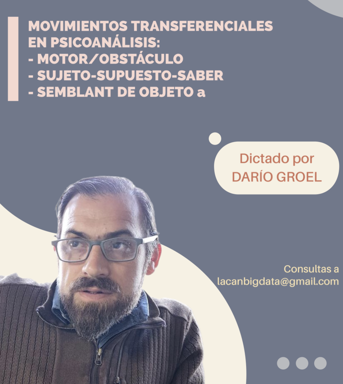 - Curso Virtual Movimientos transferenciales en psicoanálisis: ….. .Para Lacan BigData, 3 encuentros en mayo y junio de 2023.
