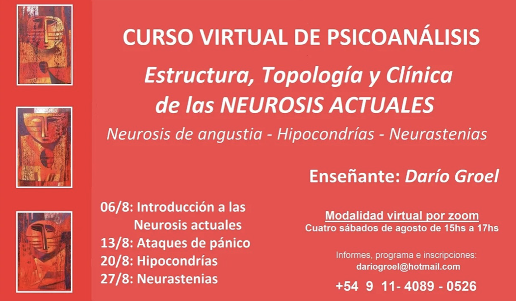 - Curso Virtual Psicoanálisis de las neurosis actuales: neurosis de angustia, hipocondrías y neurastenias. Para EPSM y Ex-sistencia, 4 encuentros en agosto de 2022.
