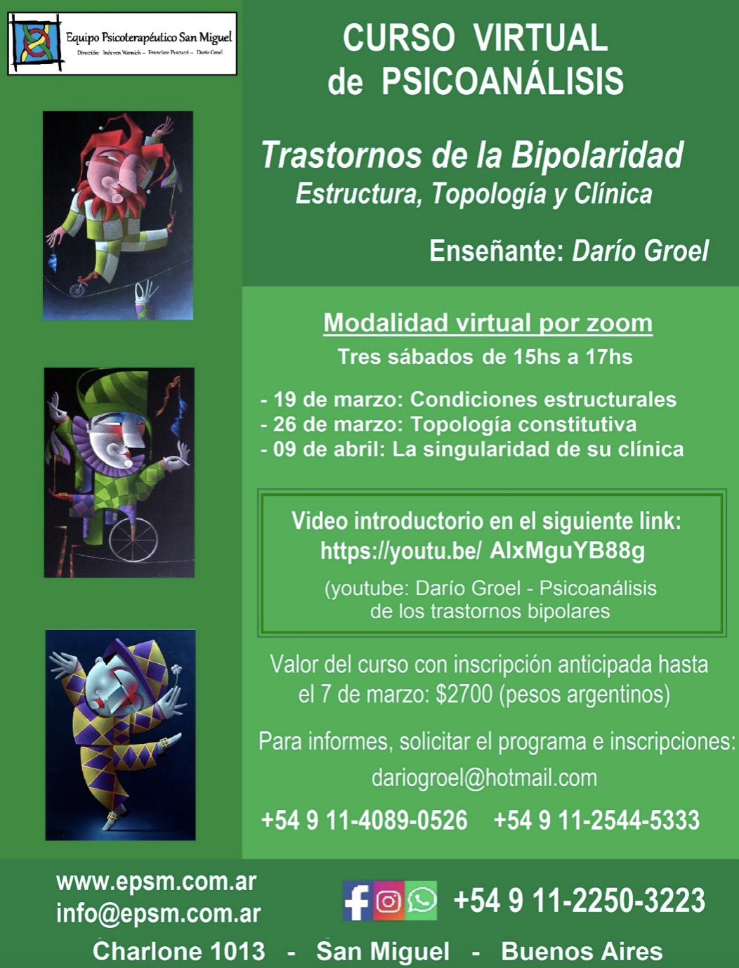 - Curso Virtual Trastornos de la bipolaridad: estructura, topología y clínica. Para EPSM y Ex-sistencia, 4 encuentros en marzo y abril de 2022.